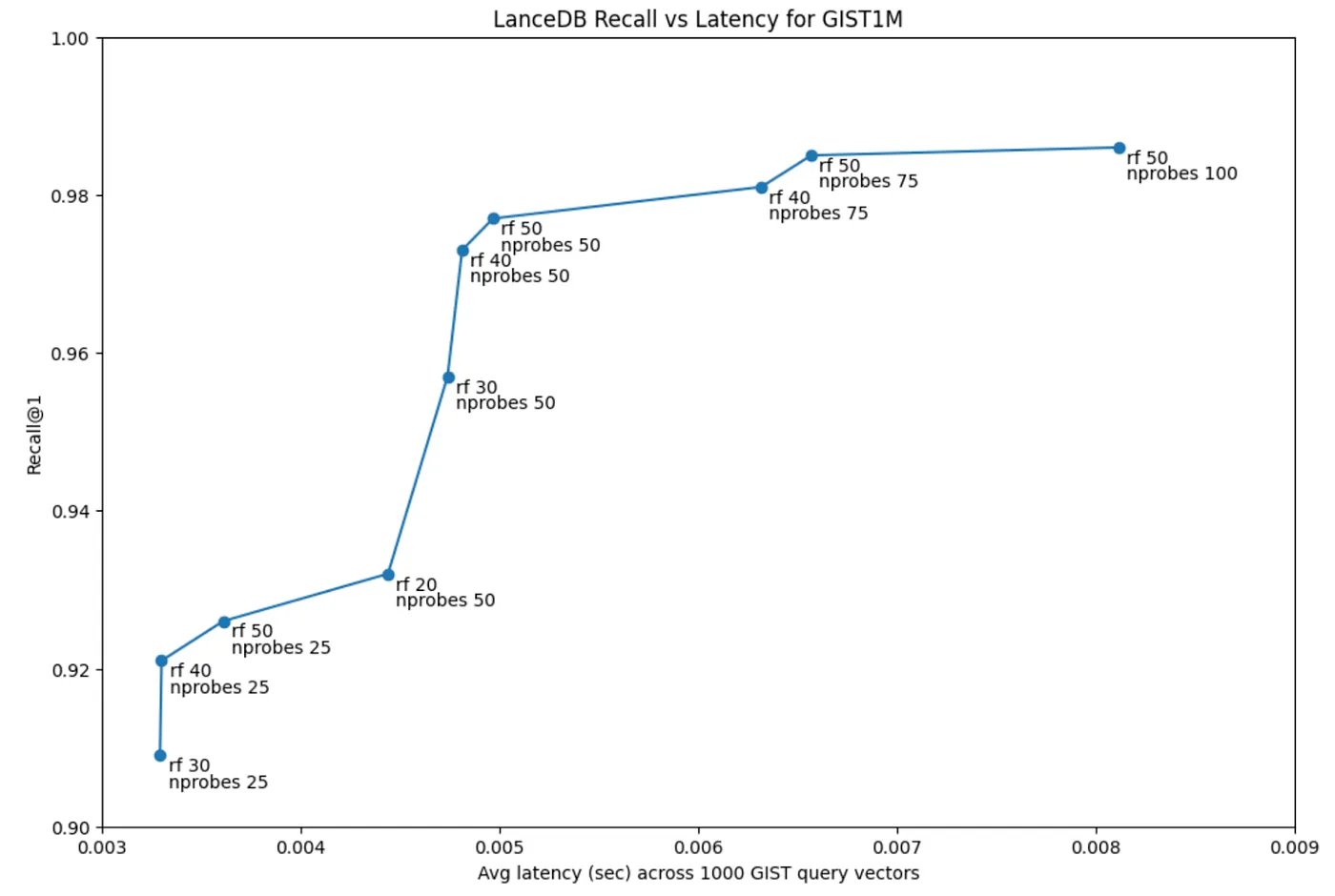When using an IVF-PQ index, there’s a trade-off between recall and latency at query time. You can improve recall by increasing the number of probes and the refine_factor. In our benchmark on the GIST-1M dataset, we show that it’s possible to achieve >0.95 recall with a latency of under 10 ms on most systems, using ~50 probes and a refine_factor of 50. This is, of course, subject to the dataset at hand and a quick sensitivity study can be performed on your own data. You can find more details on the benchmark in our blog post .
